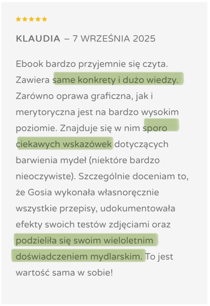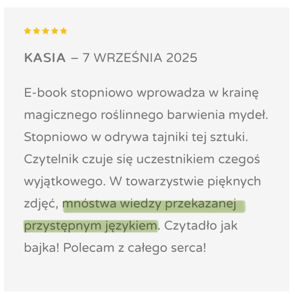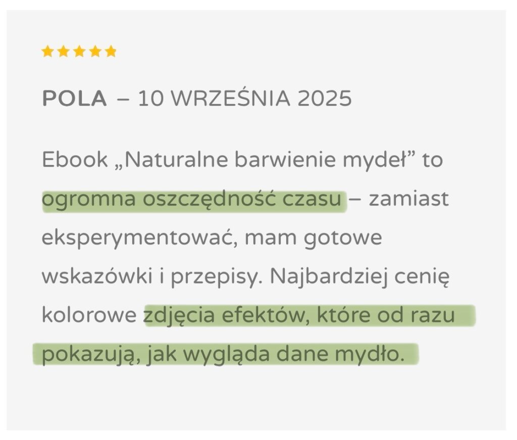 Dziś w Mydlanych Rewolucjach pokazuję, jak świadomie pracować z kolorem w mydle, rozumieć zachowanie naturalnych barwników i uzyskiwać powtarzalne efekty. Ten ebook powstał po to, żebyś nie musiała przechodzić tej samej drogi prób i frustracji – tylko wiedziała, co robisz i dlaczego to działa.