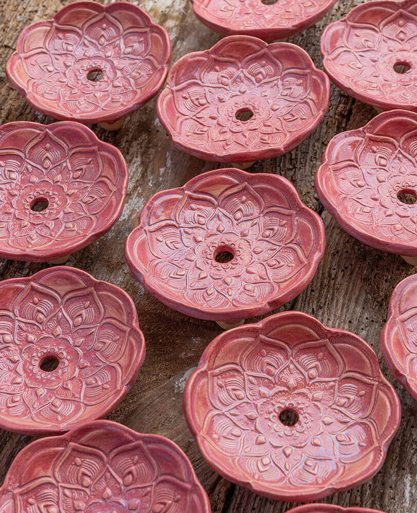 Mydelniczki w całości wykonane są ręcznie z gliny. Koronkowy wzór uzyskuje się poprzez przyłożenie do wilgotnej glinianej masy materiału z koronki. Następnie w takiej postaci pokrywa się je warstwą szkliwa. Szkliwo ma zadanie zabarwić mydelniczkę na pożądany kolor oraz sprawia, że mydelniczki są łatwe w utrzymaniu czystości. Na sam koniec wypala się je w piecu. Mydelniczki posiadają otwory, które umożliwiają swobodne odpłynięcie wody. Dzięki temu mydło nie rozmięka i wydłuża się jego trwałość. Dodatkowo mydelniczki posiadają po cztery „nóżki„, które zapewniają doskonałą stabilność.