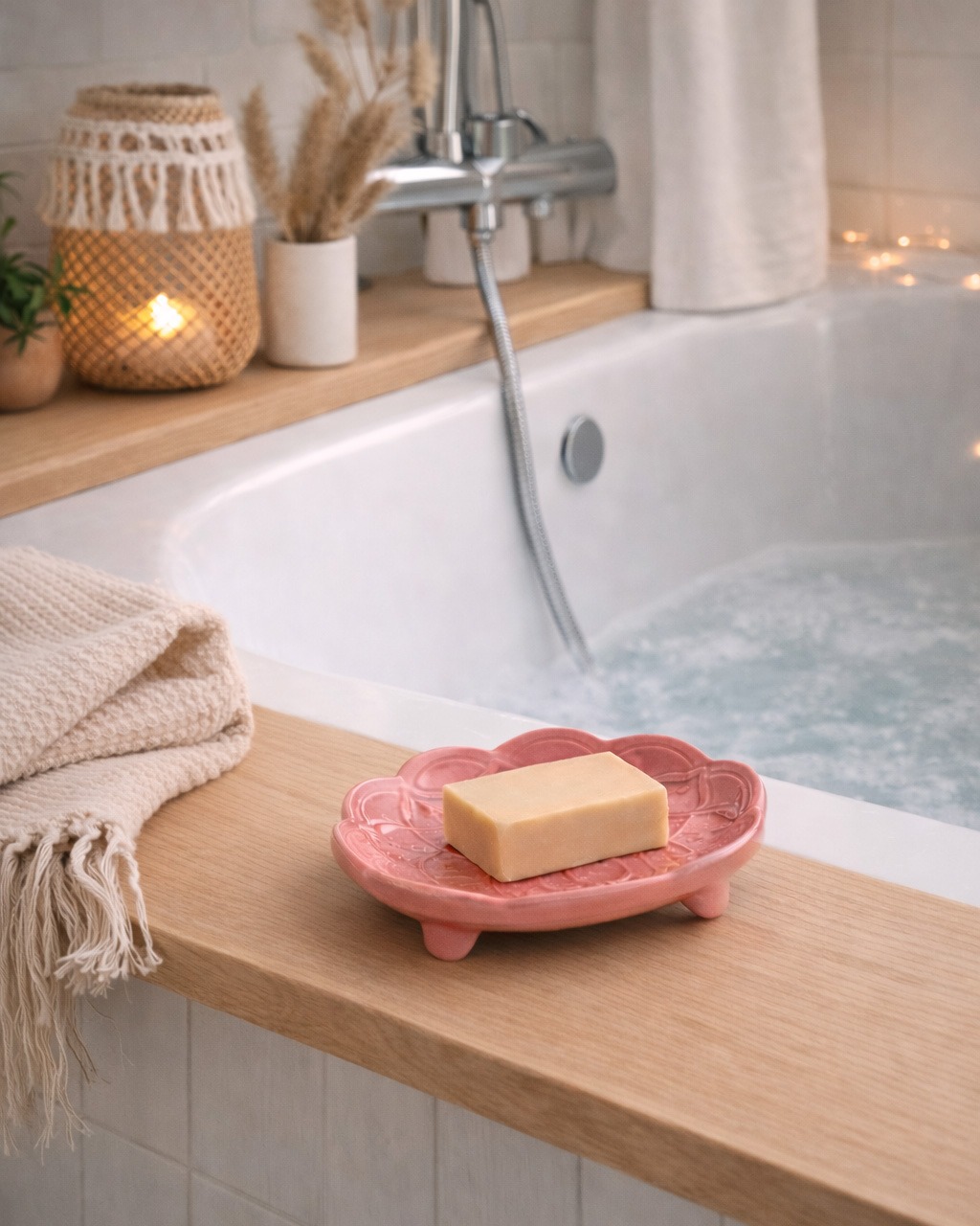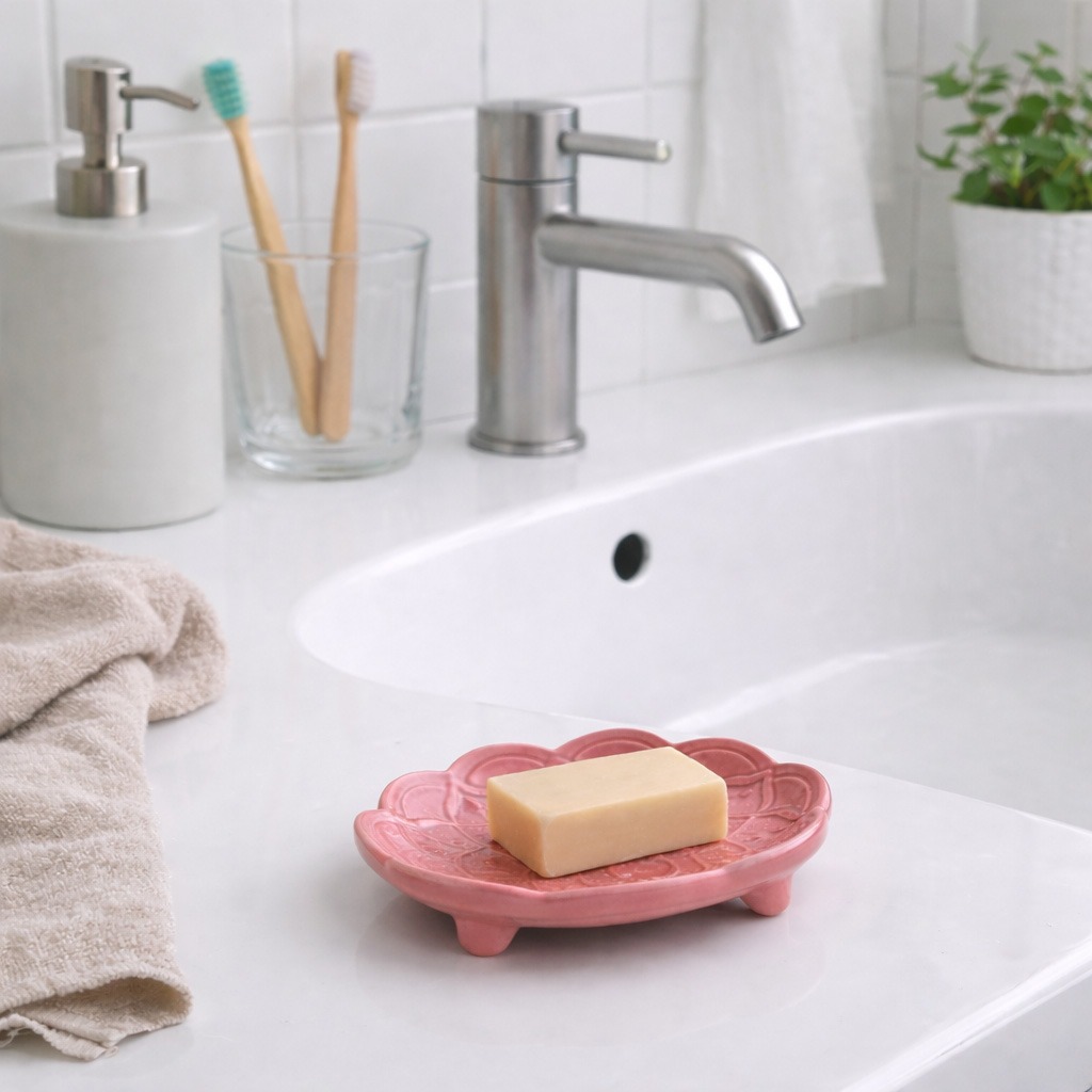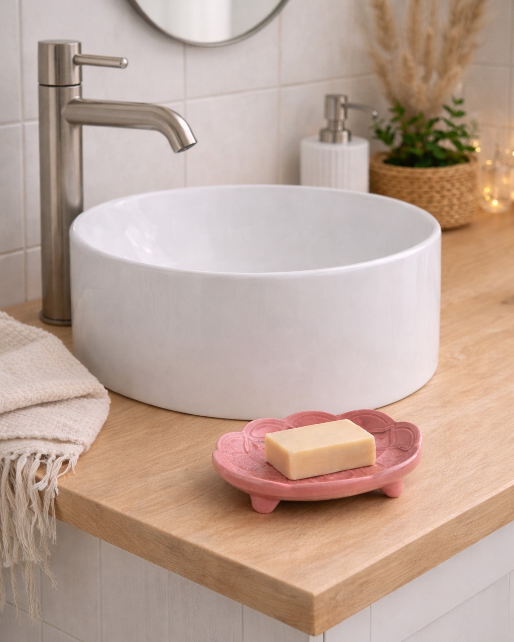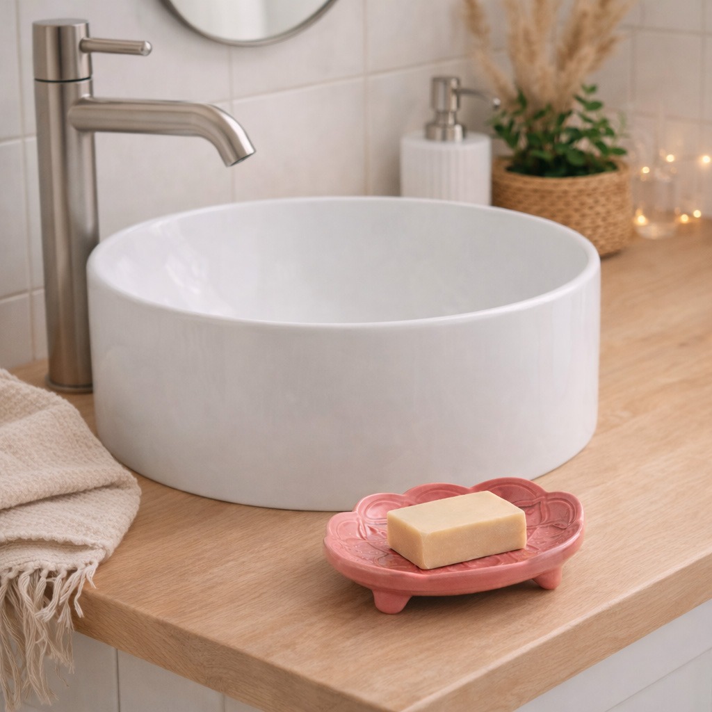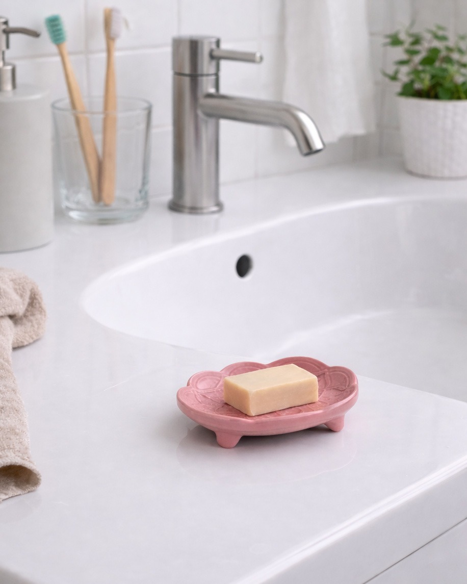 - Jasne, minimalistyczne wnętrza – biel, beże, proste formy. Mydelniczka działa jak subtelna ozdoba, która przełamuje prostotę, nie dominując przestrzeni.