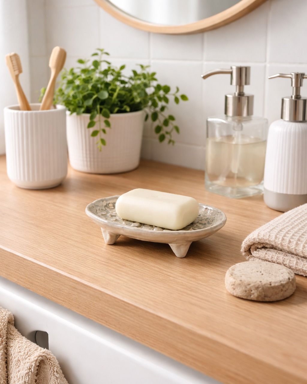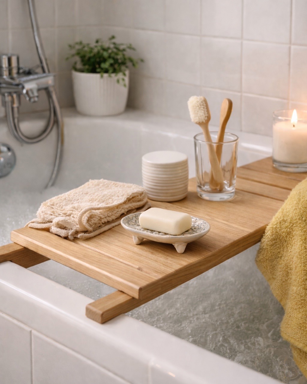 - Strefa przy wannie lub domowe spa – drewniana półka, miękki ręcznik i mydło zawsze pod ręką, forma mydelniczki sprzyja naturalnym, spokojnym aranżacjom.