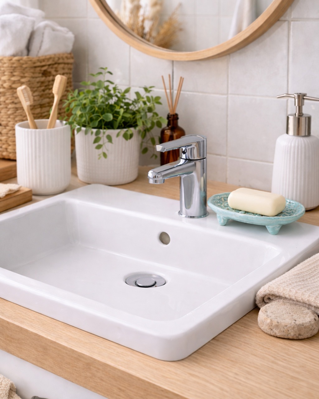 - Wnętrza skandynawskie i japandi – biel, szarości, jasne blaty i proste formy, mydelniczka pełni rolę subtelnego akcentu kolorystycznego, który ożywia przestrzeń.