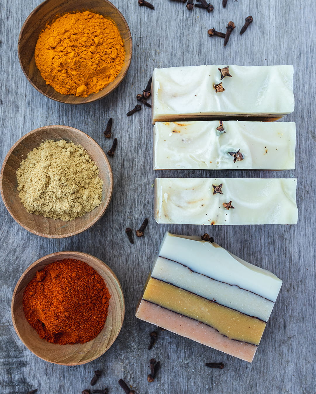 2. Barwniki naturalne jak papryka czerwona, pokrzywa czy kurkuma. Są zazwyczaj wrażliwe na upływ czasu oraz działanie światła. Z tego powodu kolor mydła może z czasem zmieniać ton – to całkowicie naturalny proces, który nie wpływa na jego jakość ani właściwości pielęgnacyjne.